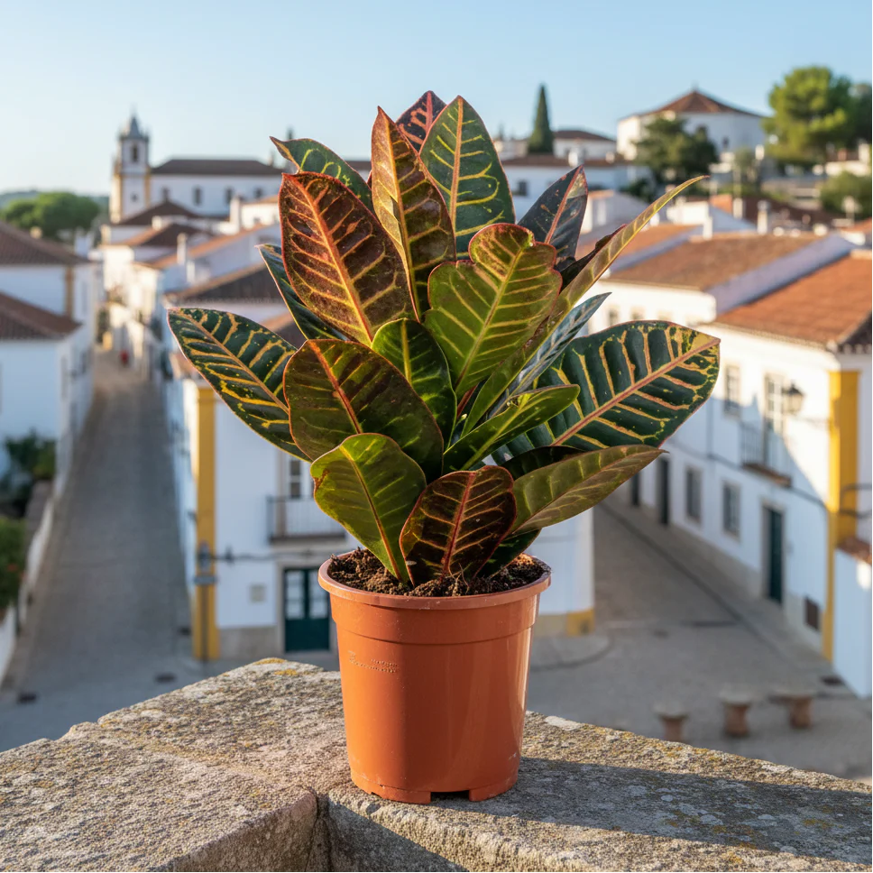 Do amarelo aos tons de verde e vermelho, as folhas da Croton Petra vão transformar o teu espaço numa obra de arte viva!