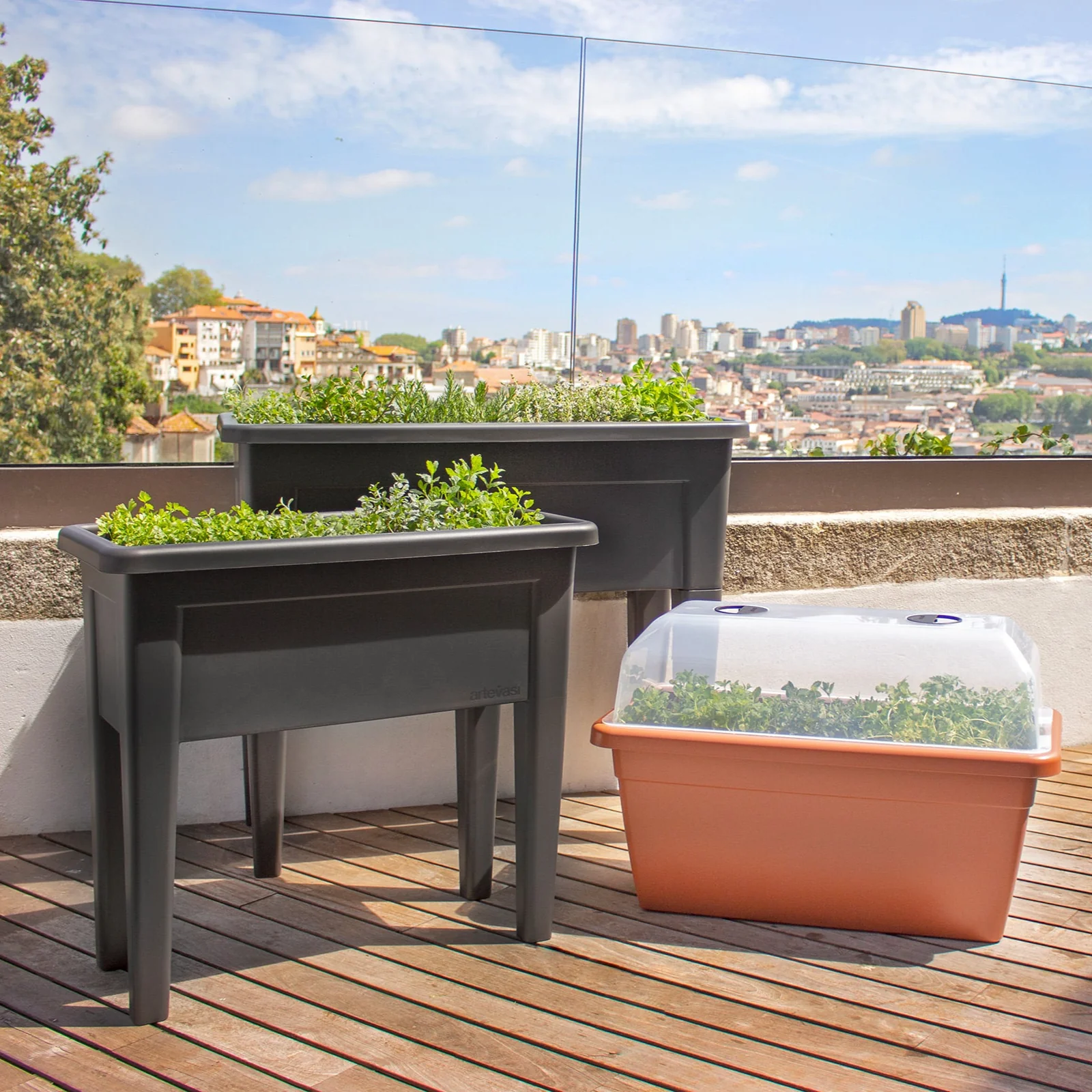 Tem uma grande capacidade e, quando combinada com a tampa transparente, promove as condições ideais para o crescimento de vegetais ou ervas aromáticas. Além disso, esta horta urbana tem 4 pernas para ficar mais alta e promover uma utilização mais confortável, tornando-a mais elegante e permitindo que se enquadre, perfeitamente, em qualquer estilo decorativo.
