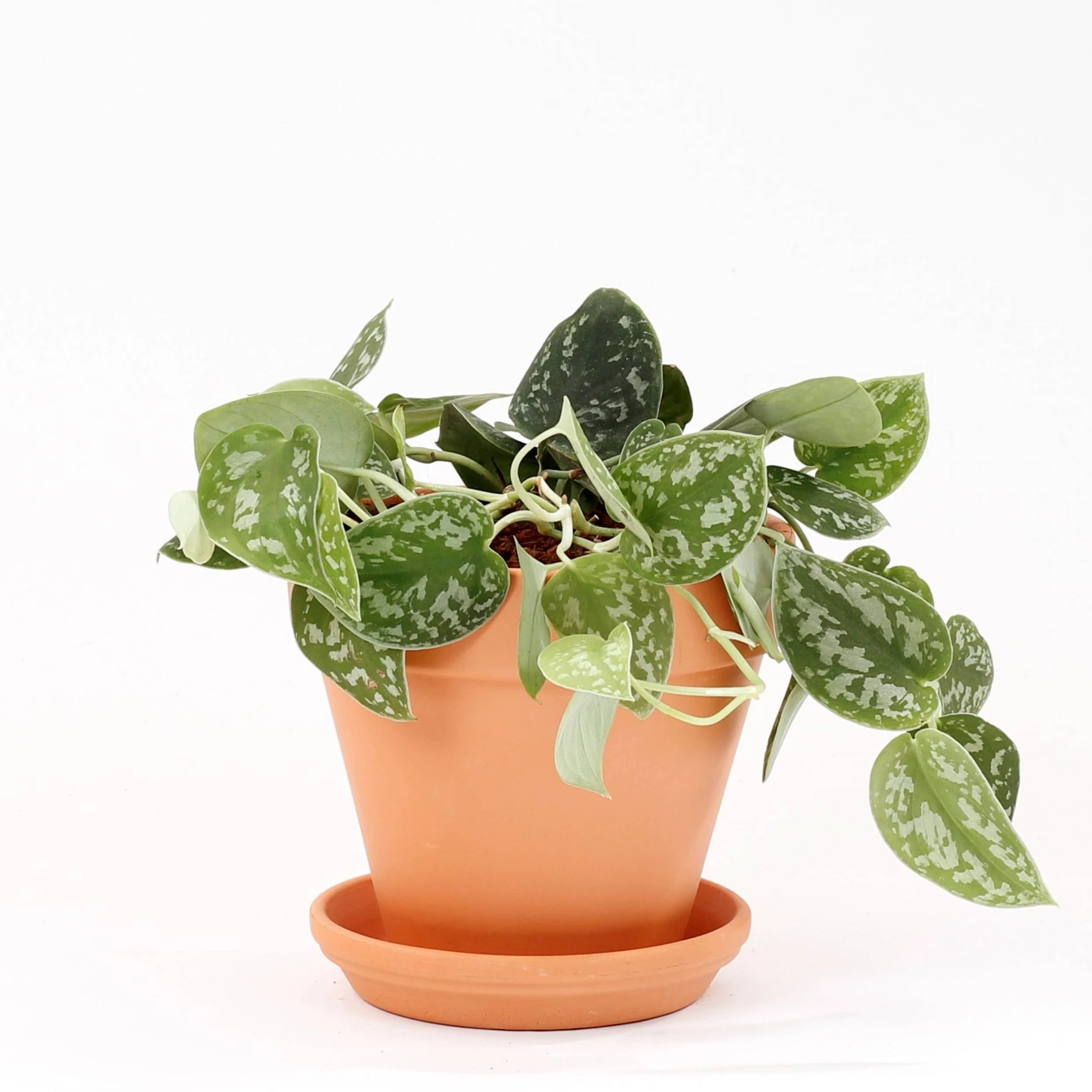 O Scindapsus pictus Argyraeus, ou Pothos Prateado, vem das florestas tropicais do Sudeste Asiático. É famoso pelas folhas em forma de coração, com um verde profundo decorado com manchas prateadas, conferindo um brilho subtil e sofisticado. Esta planta adapta-se facilmente a várias condições de luz e requer pouca manutenção, o que a torna perfeita tanto para principiantes como para quem procura uma opção de fácil cuidado.